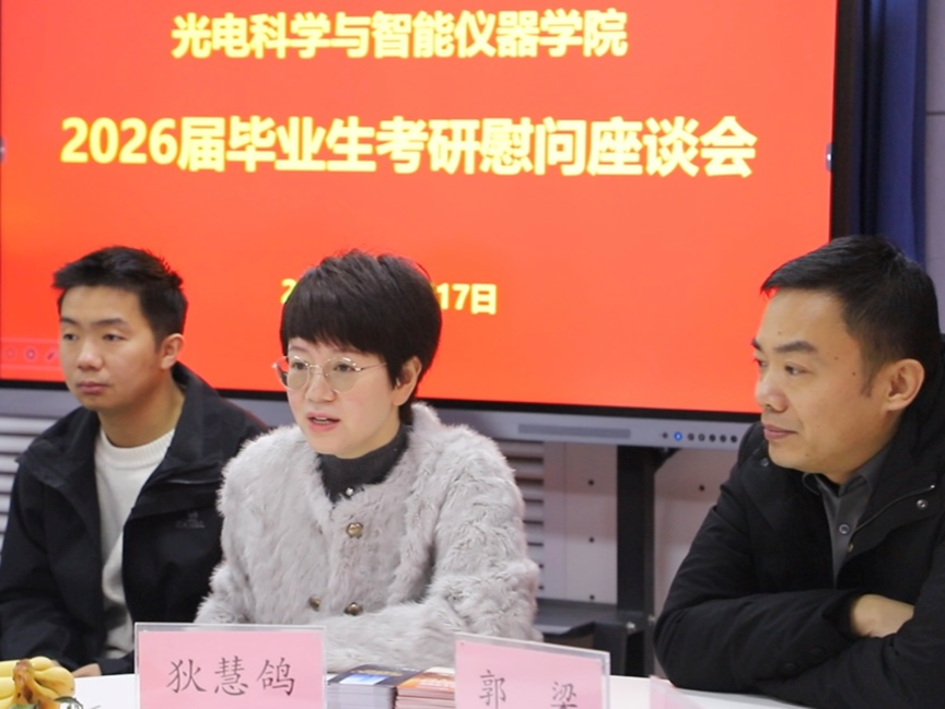 为更好鼓励首届光仪学子参加2026年研究生考试,12月17日,光仪学院在金花校区举办“冬日有暖阳,前途有星光”考研慰问会。学院党委书记郭梁、院长狄慧鸽、团学负责人刘阳璐、毕业班辅导员和考研学生代表共同参加。慰问会由院长助理、学工办主任巩晶骐主持。