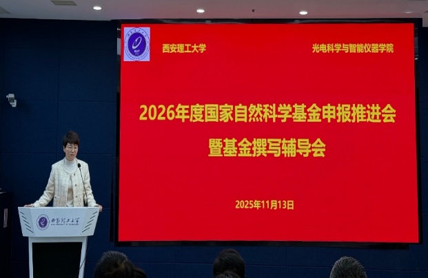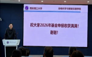 为推动科研工作高质量发展,助力2026年度国家自然科学基金申报书提质增效,11月13日上午,光电科学与智能仪器学院在1-302组织召开学院成立来的首次基金撰写辅导会。会议由邵伟副院长主持,特邀国家自然科学基金资深评审专家、西安理工大学华灯鑫教授做了基金撰写专题报告,院长狄慧鸽及学院教师五十多人参加了报告会。